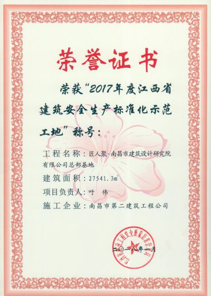 公司承建的郭家莊地塊棚戶(hù)區(qū)改造項(xiàng)目(安置房)工程、匠人聚.南昌市建筑設(shè)計(jì)研究院有限公司總部基地榮獲2017年度江西省建筑安全生產(chǎn)標(biāo)準(zhǔn)化示范工地稱(chēng)號(hào)。